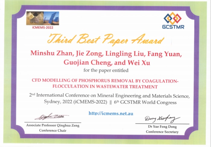 近日,基于公司牽頭承擔的集團公司2019年度重大科技創新項目《污水處理新型藥劑開發及投加量優化控制研究與示范》的“除磷藥劑智能投加系統”技術成果完成的《CFD Modelling of Phosphorus Removal by Coagulation-Flocculation in Wastewater Treatment 》論文在第2屆礦物工程與材料科學國際會議(The 2nd International Conference on Mineral Engineering and Materials Science, 簡稱iCMEMS-2022)上獲評優秀論文(三等獎)。