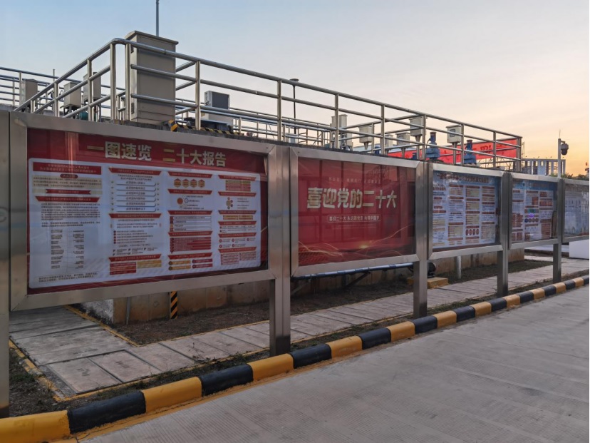 中環(huán)水務(wù)黨委堅持學習宣傳一體推進、相互促進。中環(huán)水務(wù)官網(wǎng)、官微、小程序、企業(yè)內(nèi)刊四位一體、綜合發(fā)力。精心策劃二十大宣傳專題、專欄和專刊。下屬遂溪公司黨支部在城月總廠區(qū)張貼二十大精神系列海報,其他11個廠區(qū)通過拉橫幅、張貼二十大精神要點等形式將黨的二十大精神宣傳到基層。溫州中環(huán)黨支部制作專題宣傳欄,并通過LED電子顯示屏、QQ群、微信群、生產(chǎn)會議等載體,大力宣傳二十大精神,做到二十大金句人盡皆知,營造了濃厚的宣傳氛圍。蚌埠中環(huán)黨委利用機關(guān)大院3塊LED屏循環(huán)滾動宣傳二十大精神,并在大樓門廳處制作、展示黨的二十大報告解讀宣傳板報。