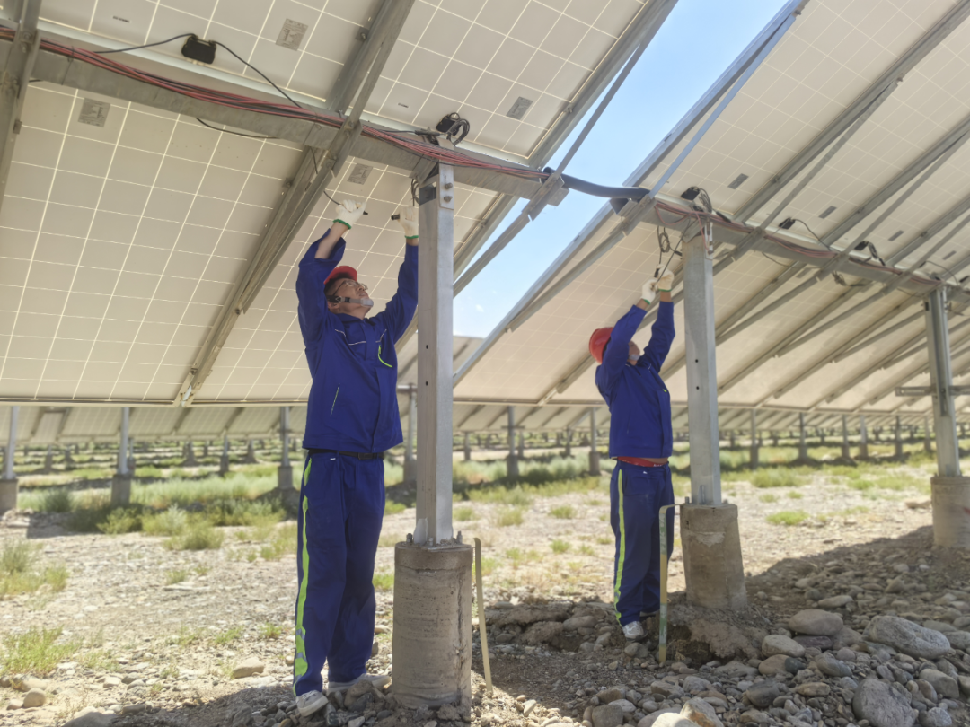 太陽(yáng)能肅州電站運(yùn)維人員正在調(diào)節(jié)光伏支架角度