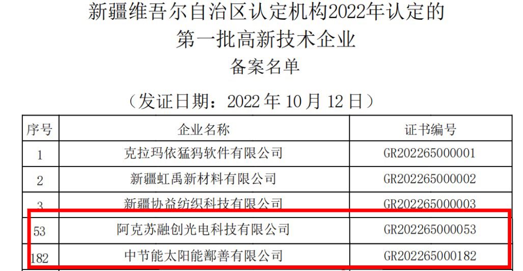 近日,全國高新技術企業認定管理工作領導小組辦公室發布了《新疆維吾爾自治區認定機構2022年認定的第一批303家高新技術企業備案名單》,太陽能新疆區下屬中節能太陽能鄯善有限公司、阿克蘇融創光電科技有限公司2家公司被認定為2022年第一批國家高新技術企業。