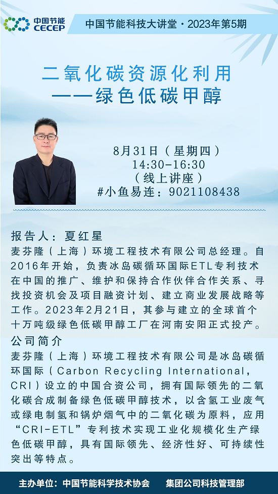 為加強綠色低碳技術交流,促進戰略性新興領域和行業前沿領域產業技術合作,集團公司科技管理部、中國節能科協特邀請麥芬?。ㄉ虾#┉h境工程技術有限公司(以下簡稱麥芬隆公司)總經理夏紅星先生于2023年8月31日作科技大講堂專題講座?,F將有關事項通知如下: